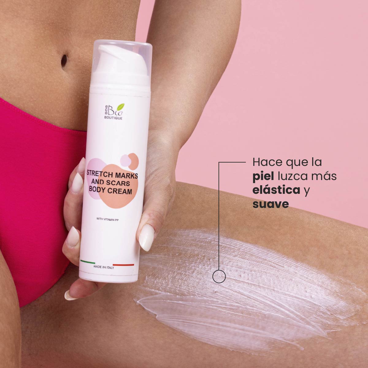 Reduce semnificativ vergeturile și cicatricile în mod natural datorită formulei sale cu vitamina PP, ulei de meadowfoam și ulei din sâmburi de struguri.