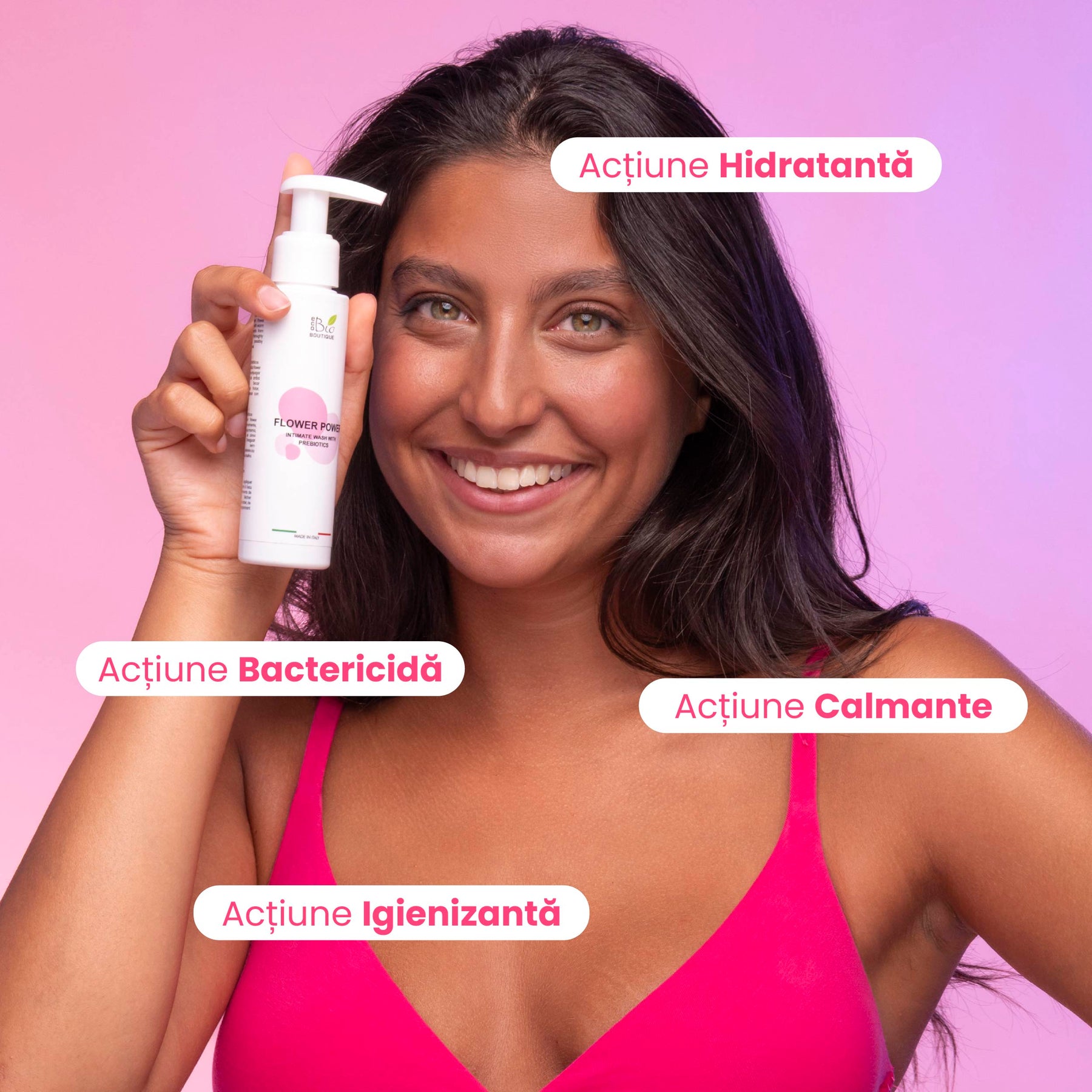 Flower Power este un puternic antibacterian și antifungic, care curăță și calmează respectând pH-ul fiziologic, prevenind dezechilibrele florei bacteriene și consolidând microbiota intimă naturală.